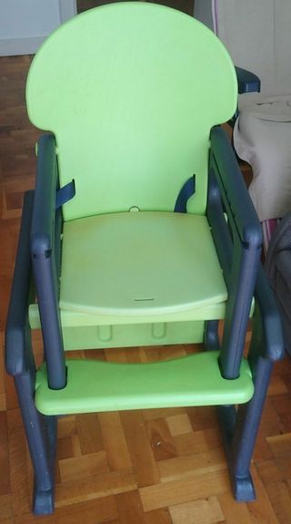 Silla alta para que el niño/a quede a la misma altura que los adultos y de esta forma desarrollar su capacidad para comer solo y relacionarse con los demás. Fácil de desmontar y llevarse. Los bordes de la bandeja sobresalen para que, si se derrama líquido, no caiga al suelo. Incluye cinturón de seguridad. Opcional: colchoncito para el respaldo y funda lavable. Si te interesa, mando fotos.