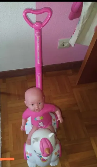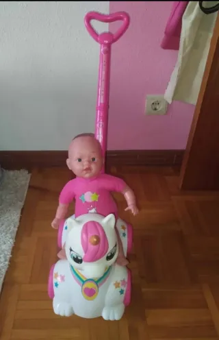 Divertido juguete para niños pequeños que combina un cochecito con forma de unicornio, una muñeca y un andador. - Cochecito de unicornio blanco y rosa. - Muñeca con vestido rosa. - Andador rosa con forma de corazón.