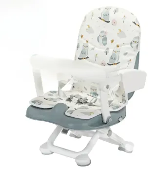 Asiento elevador plegable para niños OLMITOS Portátil • Plegable, muy ligero (650gr.) y con asa regulable para transportarlo. • Con arnes de seguridad. • Con practico bolsillo para guardar baberos, juguetes, efc. • Correas ajustables para acoplar al respaldo y al asiento de la silla.