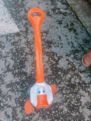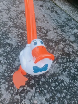 Divertido andador con forma de pato para los más pequeños. Ideal para que aprendan a caminar. - Hace ruido de pato al andar - Mango de plástico naranja. - Cabeza de pato blanca con detalles. - Alas naranjas.