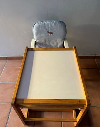 Trona evolutiva de madera con cojines. Su característica principal es que se adapta a la edad del niño/a. Puede transformarse en mesa y silla con espacio para almacenar. Estilo escandinavo. - Cojines de color verde y fucsia (por estrenar) - Diseño moderno y funcional. - Estructura de madera clara.