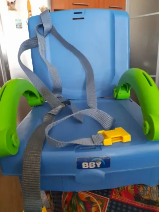 Asiento elevador BBY para silla de comedor infantil. Color azul con asas laterales verdes. - Arnés de seguridad. - Hebilla de sujeción amarilla.