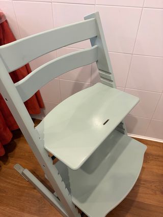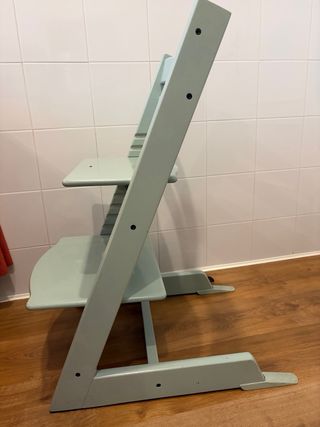 Tróna Stokke en color verde agua Se compto nueva y ha sido usada solo por un niño De madera en muy buen estado Contiene la bandeja y ek tripp trapp