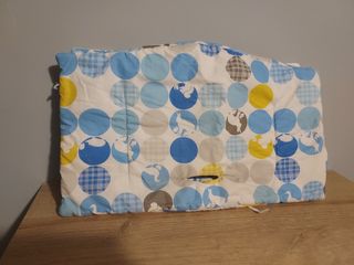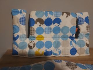 Asiento elevador plegable de la marca Olmitos, ideal para niños a partir de 12 meses. - Diseño plegable para fácil transporte y almacenamiento. - Estampado de perro en la parte frontal. - Detalle de ancla en la parte inferior.