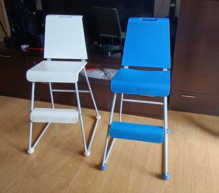 Una silla 15 y si quieres las 2 por 20€ Silla de plástico azul y blanca con estructura metálica blanca y reposapiés. - Asiento y respaldo de plástico. - Patas metálicas blancas. - Reposapiés azul y blanco