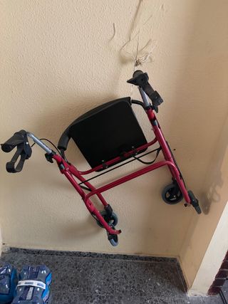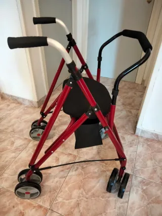 Andador de cuatro ruedas en perfecto estado, sin usar. Ideal para facilitar la movilidad. - Estructura metálica en color rojo y negro. - Asiento acolchado. - Cesta de transporte. - Ruedas delanteras giratorias.