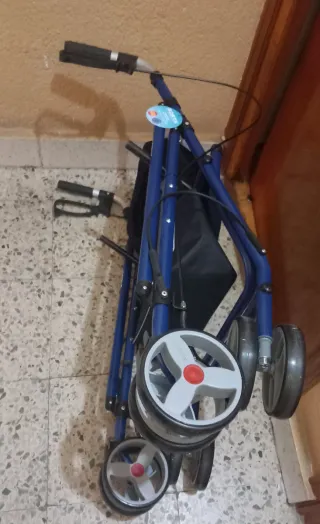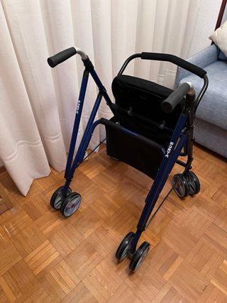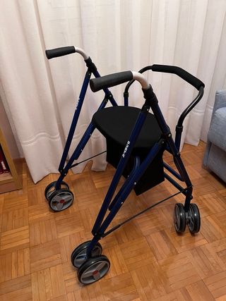 Andador con ruedas y asiento incorporado, en muy buen estado. Ideal para personas mayores o con movilidad reducida que necesitan apoyo al caminar y la posibilidad de descansar. Características: • 4 ruedas para un desplazamiento cómodo y estable • Frenos en las empuñaduras para mayor seguridad • Asiento acolchado para descansar durante los paseos • Respaldo de tela cómodo • Altura regulable en las empuñaduras • Plegable, fácil de transportar y guardar • Estructura resistente y ligera Muy cuidado y listo para usar, tanto en interior como exterior.