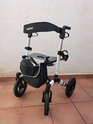 Andador ligero y resistente para personas mayores, diseñado para facilitar la movilidad en exteriores. - Estructura metálica. - Ruedas todoterreno. - Bolsa de transporte. - Frenos de mano. Es prácticamente nuevo, se ha usado 1 mes Nos costó 220 euros y está nuevo Taca taca