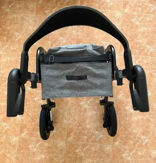 Andador con solo tres meses de uso, en buen estado - Asiento negro. - Cesta de tela negra. - Ruedas negras.