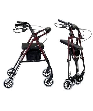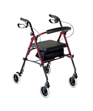 Andador de cuatro ruedas en color burdeos, ideal para facilitar la movilidad. - Asiento incorporado para descansar. - Empuñaduras ergonómicas. - Sistema de frenos en las manetas. - Cesta inferior para llevar objetos.