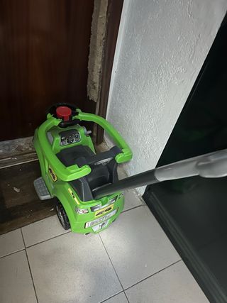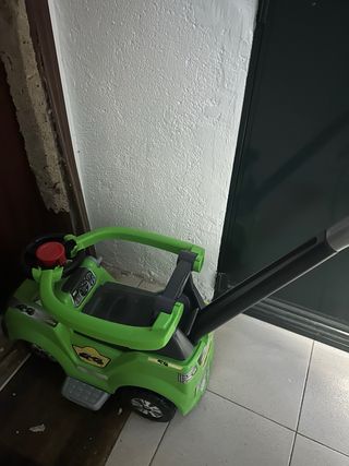Correpasillos con diseño de 4x4 en color verde. Volante con claxon. Perfecto para llevar por el centro comercial incluso por la calle pero le cuido las ruedas así que no lo hice mucho. Mi hijo lo ha usado dos veces, desde sus 9 meses. Ya le ha quedado pequeño.