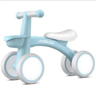 Bicicleta andador de cuatro ruedas para bebés. - Color azul pastel. - Asiento blanco acolchado. - Cesta delantera. - Ruedas con detalles blancos y azules.