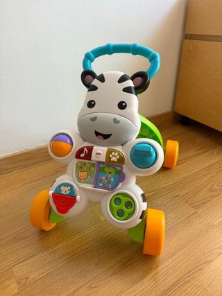 Andador para bebés con forma de cebra, ideal para que los más pequeños den sus primeros pasos. Está en buenas condiciones, aunque presenta algunas señales de uso. - Andador musical. - Contiene botones con letras, números y sonidos. - Diseño de cebra de Fisher-Price.