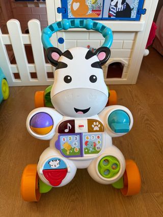 Andador correpasillos para bebé con diseño de cebra. - Divertidos colores y formas. - Ideal para primeros pasos. El andador correpasillos bebé Cebra parlanchina de Fisher-Price es un juguete diseñado para apoyar el desarrollo de habilidades motoras. Ofrece dos modos de juego: uno para jugar sentado, que incluye un libro con páginas móviles y botones que activan canciones y frases sobre letras y números, y otro para jugar de pie, donde el andador motiva al niño a caminar con frases y música. Cuenta con un asa fácil de agarrar y una base robusta con cuatro ruedas que proporciona estabilidad. Las actividades y fomenta motricidad.
