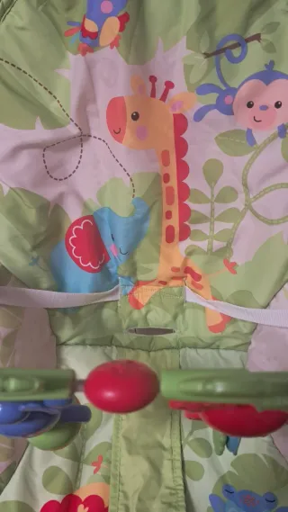 Silla para bebé con un diseño divertido y colorido, inspirada en la selva. - Incluye varios juguetes colgantes. - Tejido suave y acolchado. - Estampado de animales y hojas. Marca Fisher Price Como nuevo, sin manchas