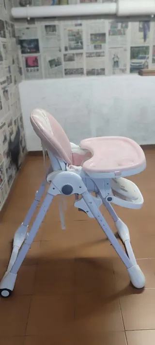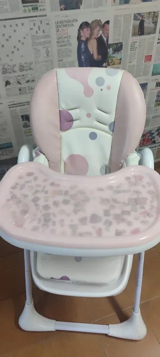 Ocasion Trona para bebé con un diseño alegre y funcional. - Cojín acolchado con estampado de puntos rosas y lilas. - Arnés de seguridad de 5 puntos. - Bandeja extraíble. - Estructura blanca y plegable. solo Cantabria recojer en mi casa tl 686 6244 97 Para informar