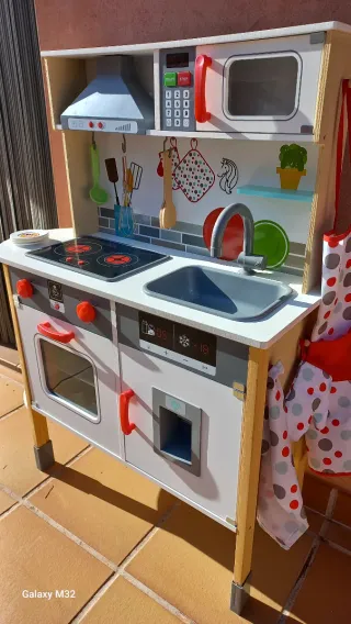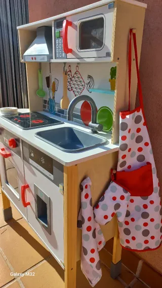 Divertida cocina de madera para niños, con detalles que la hacen muy realista.Como nueva. - Incluye campana extractora. - Fregadero con grifo. - Encimera con fogones. - Horno y microondas. - Accesorios de cocina.