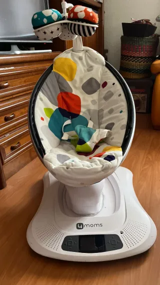 Hamaca para bebés de la marca 4moms. Cuenta con un diseño moderno y un asiento acolchado. - Múltiples patrones de colores en el cojín. - Juguetes colgantes. - Base blanca con controles.