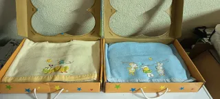 Conjunto de mantas para cuna con bonitos bordados. - Manta de color crema con bordado de oruga y mariposas. - Manta de color azul con bordado de animales. - Presentado en caja decorada.