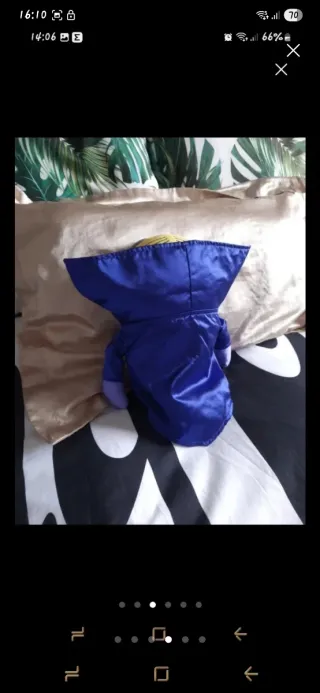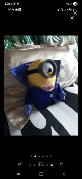 Peluche de Minion con temática de vampiro. Ideal para coleccionistas o fans de la saga. - Diseño de vampiro con capa azul. - Colmillos y ojos característicos. - Material de felpa suave. -Ojo de plástico duro.