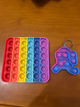 Set de dos juguetes antiestrés. - Un Pop It cuadrado con diseño de arcoíris. - Un llavero con forma de personaje de Among Us, en colores azul y rosa.