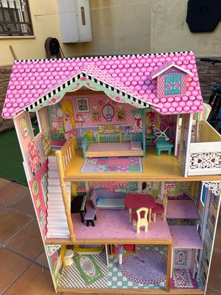 Encantadora casa de muñecas de madera, lista para horas de juego. - Estructura de madera. - Techo rosa con diseño. - Incluye varios accesorios para amueblar. - Escaleras interiores. - Ventanas decoradas.