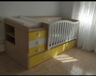 Cuna de bebé que se transforma en cama para niños pequeños. Fabricada en madera. - Diseño moderno en color blanco y amarillo. - Cajones integrados para almacenamiento. - se convierte en cama nido (2 camas) + escritorio y cajoneras. Colchón no incluido.