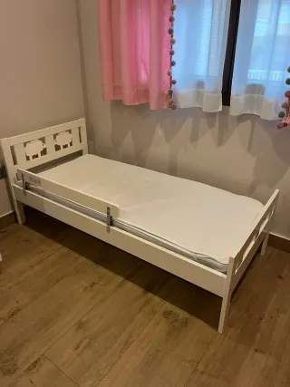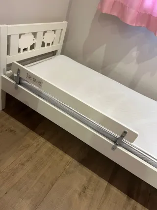 Cama infantil de Ikea con un diseño de ovejas en el cabecero. La base de la cama es de láminas de madera. En la ultima foto estan las medidas. Solo la parte lateral de la cama que estuvo pegada a la cama grande se encuentra con un rayon despintado pero con una capa de pintura queda genial. Viene con doble barra de seguridad e incluye 2 cubrecolchones y varias sabanas. - Estructura blanca. - Diseño de ovejas en el cabecero.