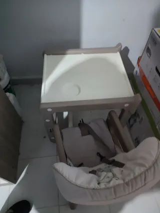 Trona de bebé con un divertido estampado de jirafa en el cojín. - Cojín acolchado y lavable. - Arnés de seguridad de 5 puntos. - Reposapiés. - Se convierte en mesa y silla. - Desmontable.