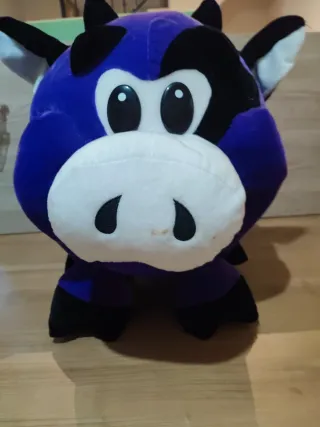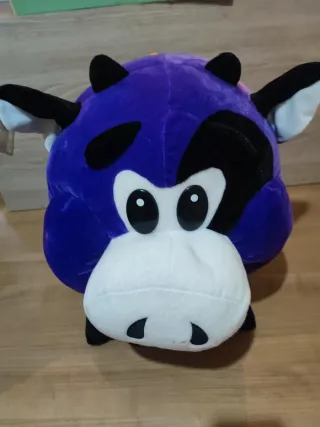 Peluche suave con forma de vaca. - Color morado con manchas negras. - Ojos grandes y blancos. - Nariz blanca con detalles negros.