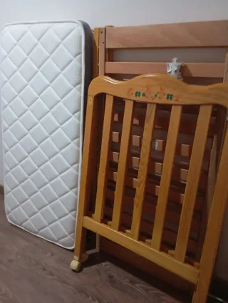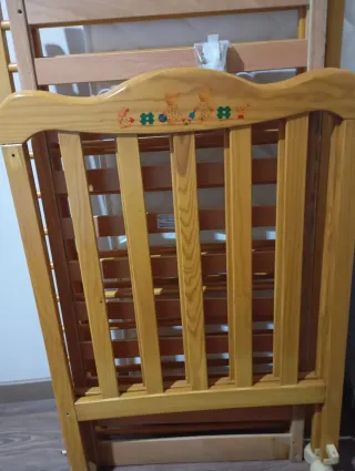 Cuna de madera para bebé, es antigua. - Acabado natural de la madera. Tiene desperfectos pero sirve perfectamente. Se la regalo a quien venga a buscarla a Getafe, zona hospital.