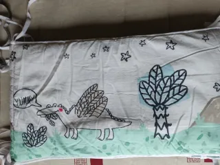 Protector de cuna con un divertido diseño de dinosaurios y estrellas. Ideal para darle un toque alegre a la habitación del bebé. 100 % algodón