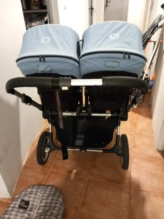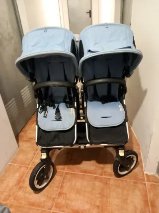 Silla de paseo Bugaboo Donkey. - Diseño funcional y versátil. - Ideal para familias. - Cómoda para el bebé. Chasis, dos capazos y dos silletas Dos capotas negras Dos capotas azul extensibles Dos colchonetas en azul Dos sacos de invierno en gris Adaptadores de maxi-cosi Dos burbujas de lluvia Dos parasoles Dos ruedas de repuesto Regalo cesta versión individual Regalo dos fundas invierno maxi-cosi