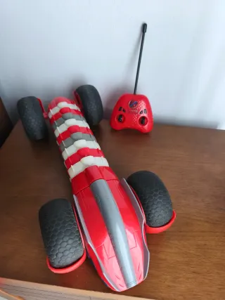 Coche teledirigido con un diseño llamativo en colores rojo, blanco y gris. Incluye su mando a distancia para controlarlo. - Diseño segmentado en el cuerpo. - Ruedas grandes y robustas.