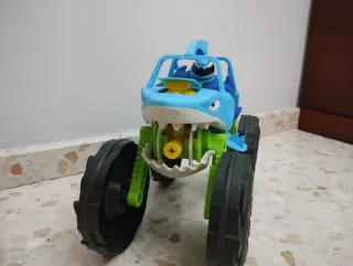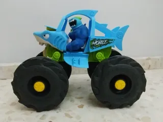 Divertido coche de juguete con diseño de tiburón y ruedas de monster truck. - Color principal azul con detalles verdes. - Figura de tiburón conductor. - Ruedas grandes de goma negra. - Inscripción MOBILE en un lateral.