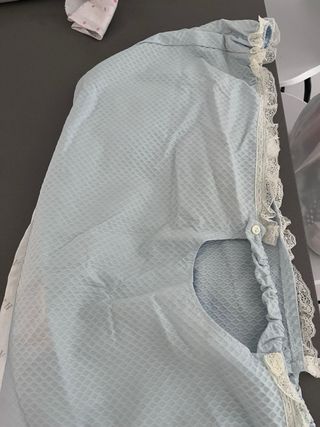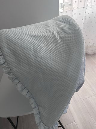 Conjunto de cubre capazo y capota en color azul claro, con un diseño de tejido tipo gofre y un delicado volante. - Tejido tipo gofre. - Detalle de volante en los bordes.