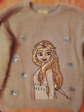Precioso jersey de punto suave con la imagen de Elsa de Frozen. - Detalle de lentejuelas brillantes en el dibujo y en forma de copos de nieve. - Manga larga. - Talla 6-8 años.