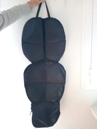 Protector de asiento de coche diseñado para colocar una sillita infantil. - Material resistente y duradero. - Diseño acolchado para mayor protección. - Fácil de instalar y limpiar. -La parte de abajo tiene Dos compartimentos que están un poco descosidos. Se puede coser o recortar y quitar.
