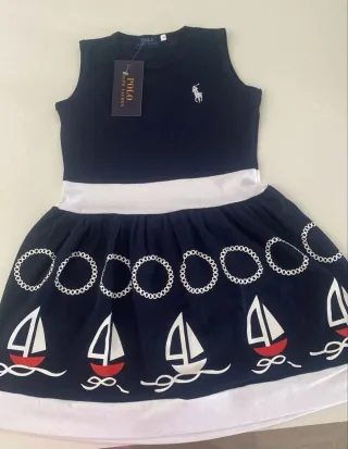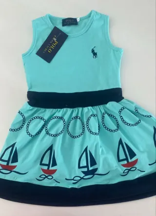 Vestido de niña de la marca Polo Ralph Lauren. Diseño elegante y marinero. - Color azul marino. - Detalle de cinturón blanco. - Estampado de veleros y anillas. - Sin mangas. Vordado