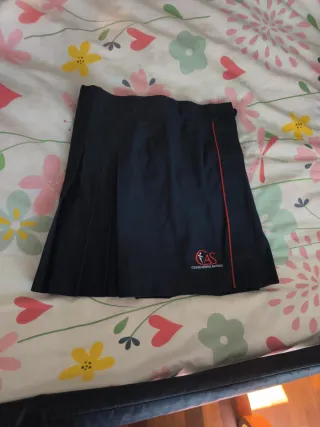 Falda escolar de uniforme del colegio Somascos. Santiago Apóstol - Color azul marino. - Diseño plisado. - Logo del colegio bordado en la parte delantera. - Detalle de ribete rojo.