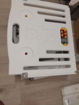 Corralito para bebés en colores blanco y gris, con diseño de ositos. - Paneles de plástico resistentes. - Puerta de seguridad. - Fácil de montar y desmontar.