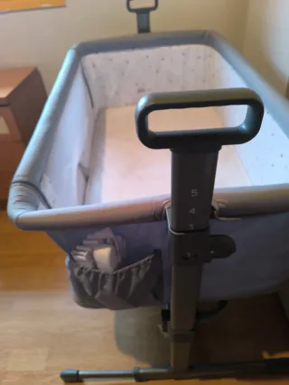 Cuna de colecho Kinderkraft con 5 posiciones de altura. - Estructura gris. - Interior blanco con estampado de estrellas negras. - Laterales de malla transpirable. - Con su bolsa para transportar si es necesario. Tiene una pestaña rota pero sigue funcionando perfectamente no deja de cumplir su función, es en parte estético y ni eso porque queda tapado por la cremallera y funda