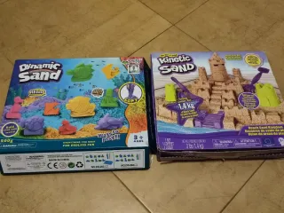 Se venden dos cajas de arena mágica, una de Dynamic Sand y otra de Kinetic Sand. - Caja Dynamic Sand: 500g. - Caja Kinetic Sand: 1.4 kg (Beach Sand Kingdom). - Incluye moldes y herramientas.