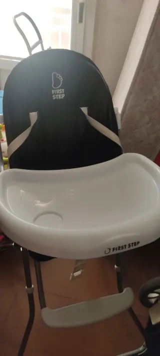 Trona plegable de la marca First Step. - Asiento acolchado negro. - Arnés de seguridad de 5 puntos. - Estructura metálica. - Bandeja blanca. - Plegable para fácil almacenamiento.