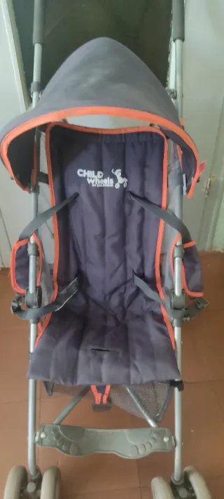 Carro de bebé de la marca Child Wheels, ideal para paseos. - Capota con borde naranja. - Arnés de seguridad. - Cesta inferior de malla.