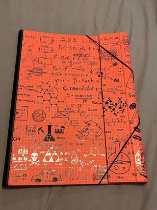 Carpeta escolar con un diseño único lleno de fórmulas y dibujos científicos. Ideal para estudiantes de ciencias. - Cubierta con motivos de física, química y matemáticas. - Hojas interiores cuadriculadas.