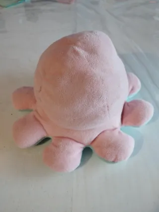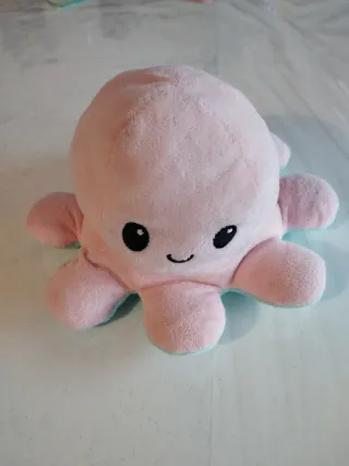Este adorable peluche de pulpo es reversible, mostrando dos colores. - Color principal: Rosa. - Color secundario: Azul claro. - Material suave y tierno.