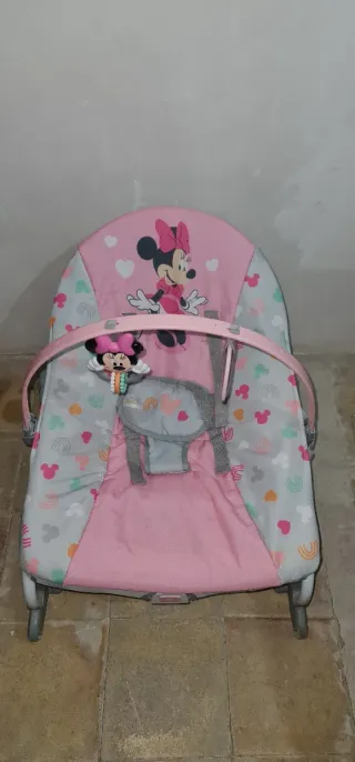 Mecedora infantil con diseño de Minnie Mouse. Perfecta para los más pequeños. - Tejido suave y cómodo. - Estructura resistente. - Divertido estampado de Minnie Mouse. - Asiento reclinado - Arnés de seguridad - Vibración Tiene pequeñas mordeduras de mi perro pero no le afecta a la mecedora, solo lo estético, la mecedora la use solo un mes.