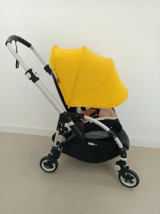 Silla de paseo Bugaboo Bee 5 en color amarillo. Perfecta para el día a día. - Capota extensible. - Cesta de compras. - Ruedas giratorias. Vendo Bugaboo Bee 5 en muy buen estado, solo tiene despellejado la funda de donde se lleva, del uso pero se puede cambiar. Tiene 2 capotas, una azul con mosquitera por delante, aberturas con rejilla también en los laterales y una ventanilla arriba que se puede abrir o cerrar con el botón y otra amarilla. Las dos originales de Bugaboo, se queda bastante plano al cerrarlo, se reclina bastante hacia atrás. Incluye también la colcha que se ve en la foto también original de Bugaboo, la bolsa y el capa