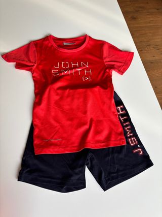 Conjunto deportivo de camiseta y pantalón corto de la marca John Smith. - Camiseta roja con estampado frontal. - Pantalón corto azul marino con detalle lateral.